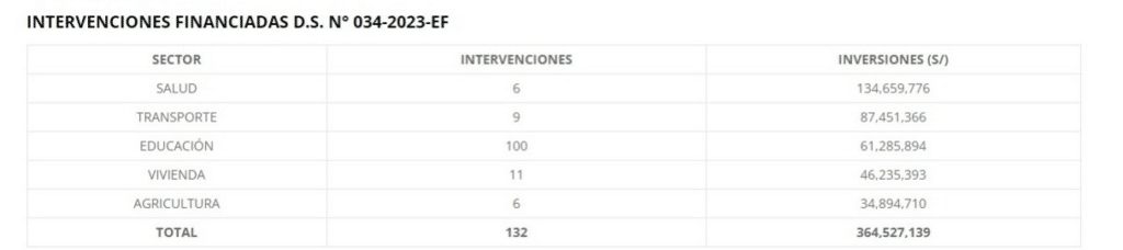 A través del Decreto Supremo N° 034-2023-EF, el presupuesto asignado será ejecutado por los tres niveles de gobierno nacional, regional y local para diversos proyectos en los sectores de salud, transporte, educación, vivienda y agricultura en las regiones de Piura, Tumbes, La Libertad, Lambayeque, Áncash, Lima, Arequipa, Cajamarca, Huancavelica y Ayacucho.