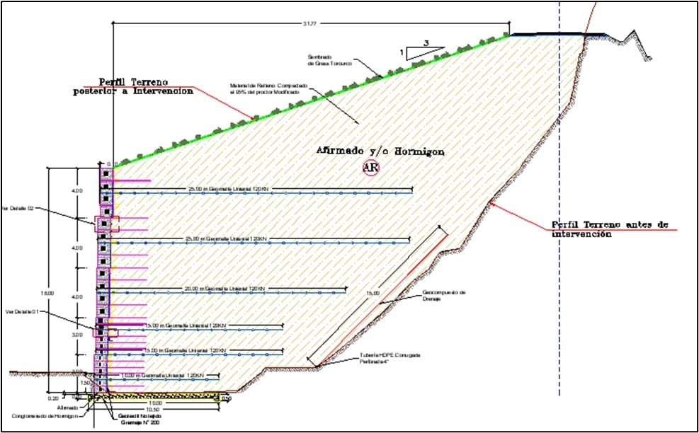 En la Imagen N°02, se puede apreciar el esquema propuesto, el cual esta conformado por un Muro de 18m de altura con refuerzos adicionales de geomallas Uniaxiales de longitudes entre 10 a 25m, el cual está cimentado sobre un conglomerado de hormigón con compactación controlada envuelta en geotextil.