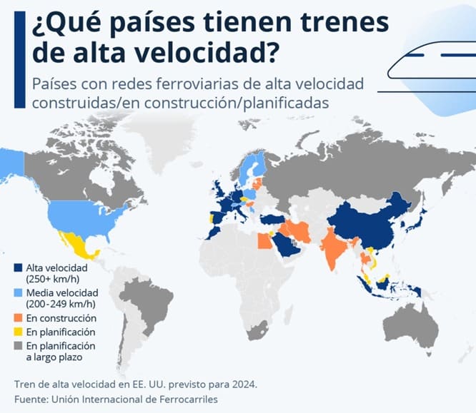 3. ¿Qué países tienen trenes de alta velocidad? Statista. 06.09.2024. https://es.statista.com/grafico/32994/paises-con-redes-ferroviarias-de-alta-velocidad-construidas-en-construccion-planificadas/